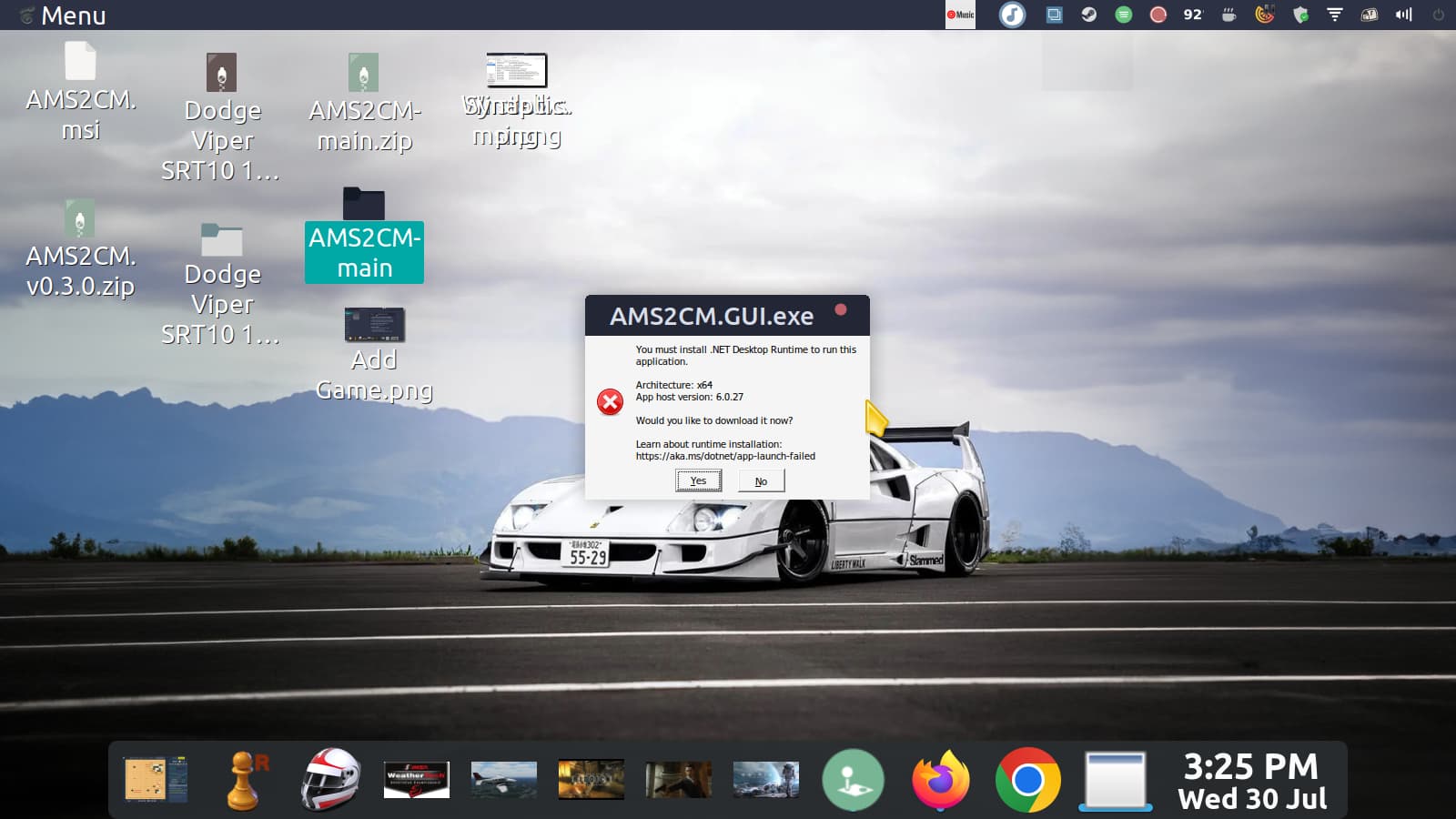 Hi. I’m trying to use Lutris to install Automobilista 2 Content Manager. I was previously using PlayOnLinux, but I read that the app is now considered obsolete. As you can see, I almost have the program running, but the error window states that I need .Net Desktop Runtime and asks me if I want to download it. However, after clicking Yes, the computer does not download it. I thought I had solved this .NET issue with the packages I downloaded using Synaptic. I have also posted to Ubuntu Mate Community’s Forum.