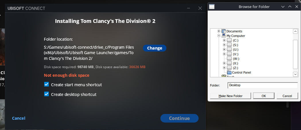 Trying to install The Division 2 via Ubisoft Connect which I installed via Lutris, but when I try to select partition where to install it says: “Not enough space” even though I have it.