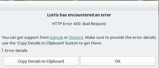 I bought the Starter Edition of EU IV on GOG which should come with some DLCs. While the Basegame works fine, I am not able to install the DLCs. As soon as I click “Install DLCs” in the Lutris GOG Library (in the context menu of the game icon), I get an Error: “Lutris has encountered an error - HTTP Error 400: Bad Request”: